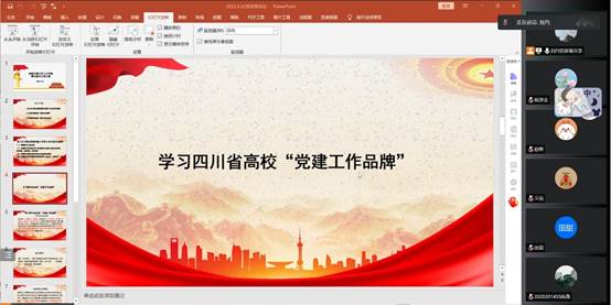 随后,刘丹同志以“打造党建品牌”为切入点,带领支部成员一起学习四川省高校的“党建工作品牌”,学习内容主要包括电子科技大学党委和西南民族大学党委打造的党建工作品牌。电子科技大学党委实施“书记项目”,开展了支部联建共建、书记赛党课、读懂中国等特色活动,打造了“红心向党”、“党史漫画”、“成电微故事”等党建品牌。西南民族大学党委以“格桑花”研究生支教团为服务载体,成立“小石榴”校园宣讲团,联合公司民汉双语志愿服务团搭建“小石榴直播间”开展中华传统文化教学,同时开展了“情暖高原-助力防疫”、“彩虹计划”等系列线上支教活动、“手拉手”专项服务。